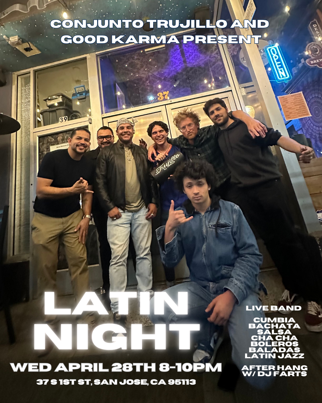 Latin Night at Good Karma Downtown San Jose Wednesday, April 29, 2026 8:00 PM 11:59 PM Good Karma 37 South 1st Street San Jose, CA, 95113 United States (map) Google Calendar ICS